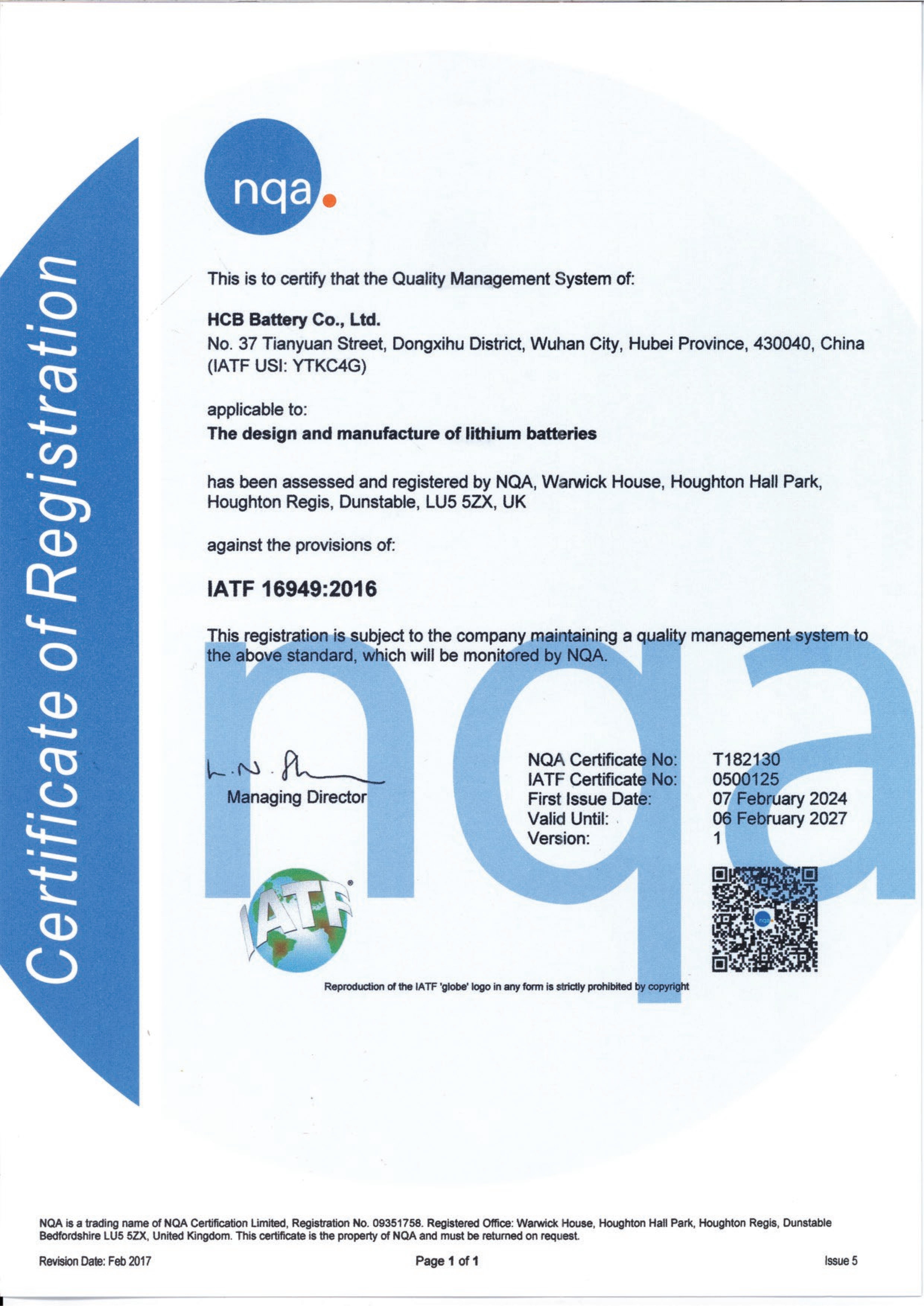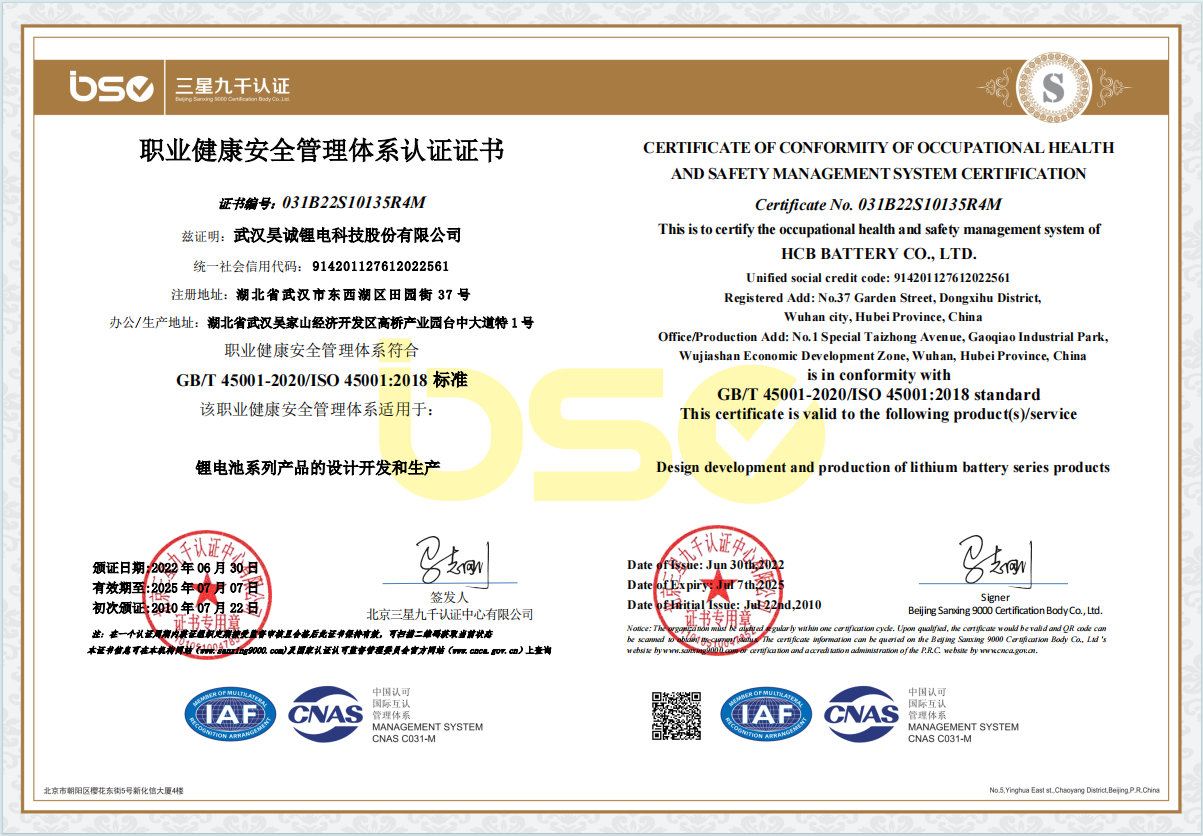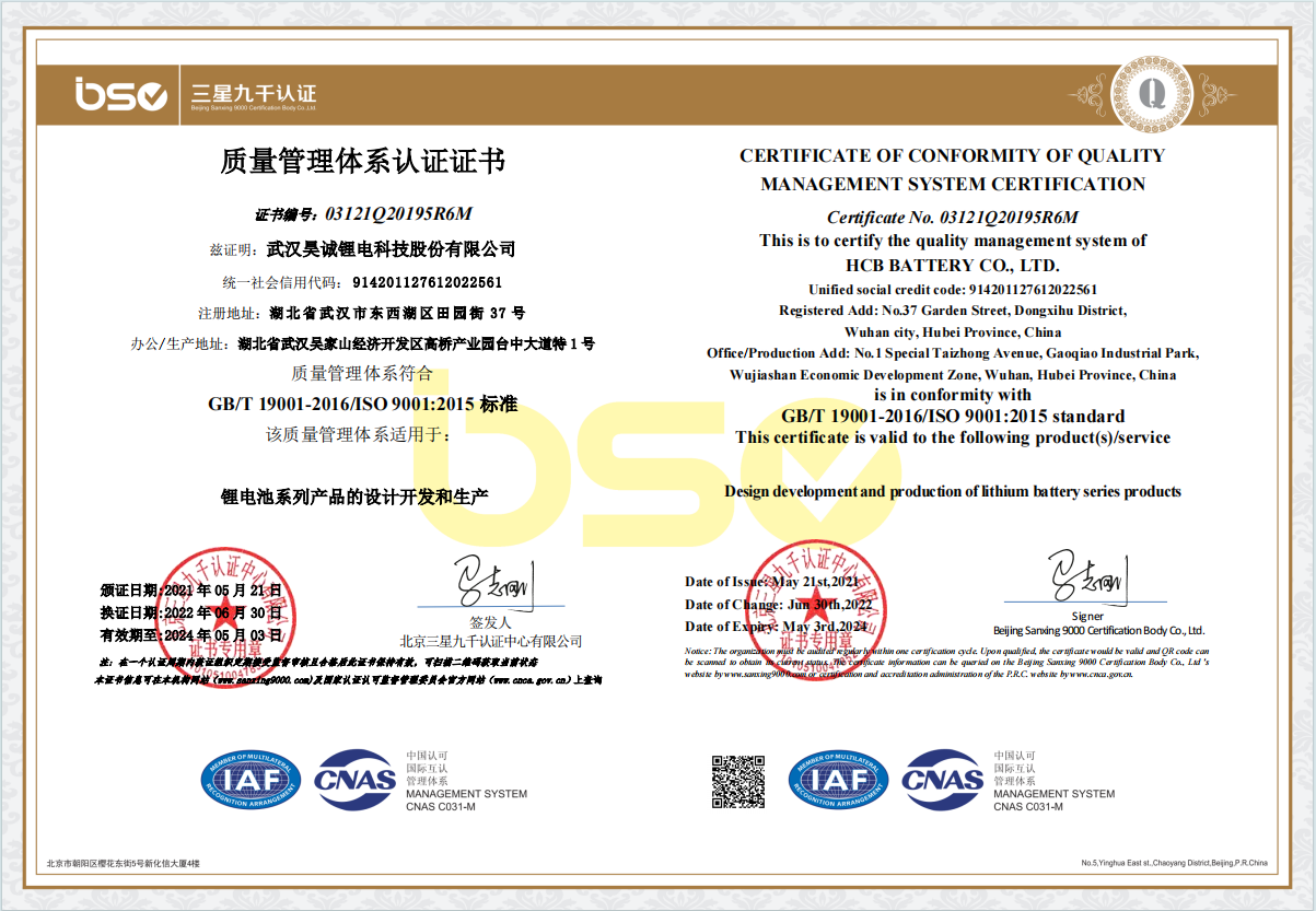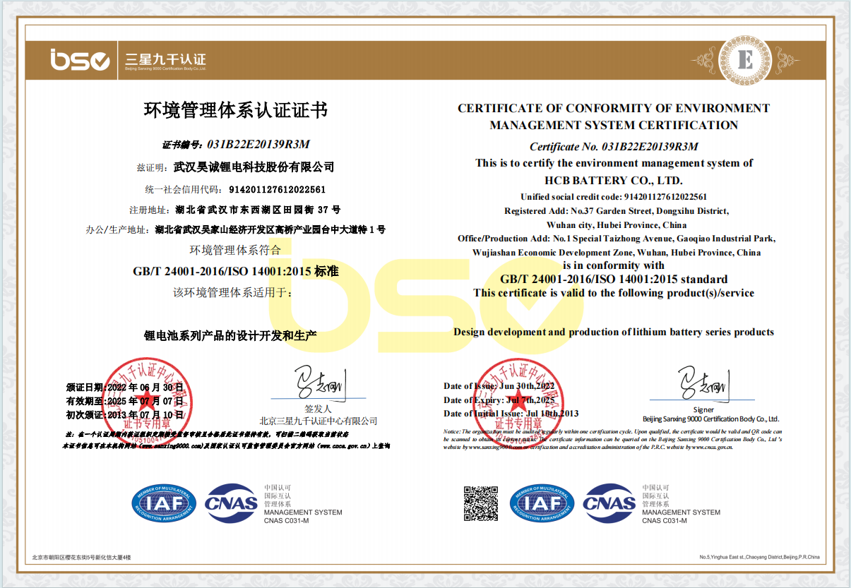 昊诚锂电生产基地已通过 ISO9001:2015、ISO14001:2015、IATF16949:2016、ISO45001:2018 及 Ecovadis 2023 认证。